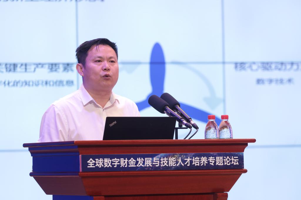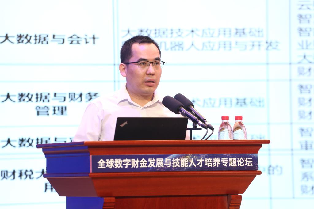 中国法学会财税法学研究会副会长、中国社会科学院大学应用经济学院研究生导师贾绍华教授以《数字化重塑全球经济秩序与以“数”治税的中国方案》为题,结合数字经济发展与国内外背景为我国税收治理带来的挑战,探讨我国税收征管现代化改革的具体方案,并提出了产教融合、科教融汇背景下财税金融技能型人才培养的新路径。