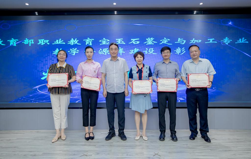 在表彰环节,项目组授予22个参建单位和企业颁发了先进单位奖和6个特殊贡献单位奖,颁发了6个特殊贡献个人奖和94余位课程建设者颁发了优秀个人奖。魏中龙和学校珠宝与艺术涉及学院执行院长张晓晖分别为获奖代表颁奖。中国地质大学出版社对《钻石鉴定与分级》等5本获评“十四五”职业教育规划教材的建设团队发来了贺信。