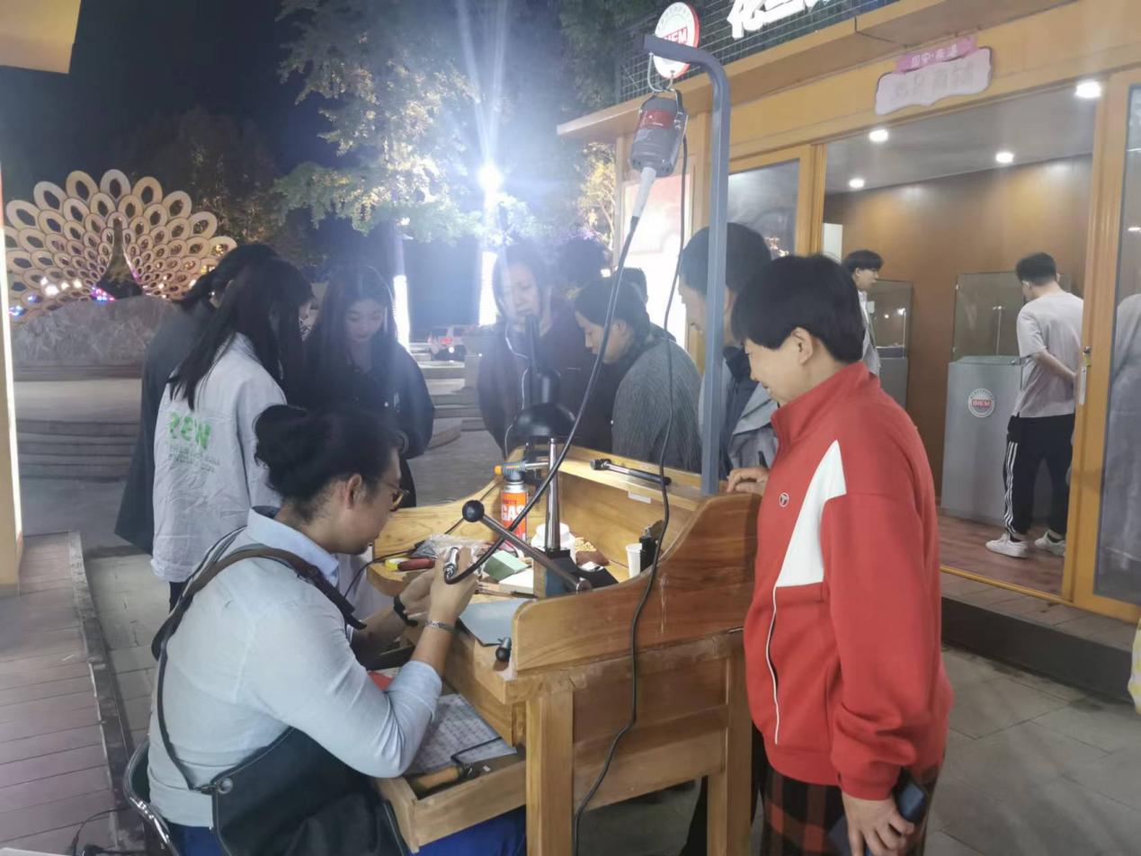 4月29日晚,在固安县中央公园“心动夜孔雀”活动上,学校“经管珠艺——珑行创客空间”“花丝镶嵌——非遗小栈”落户“中央公园一条街”1号摊位,来自珠宝与艺术设计学院珑行珠宝创业团队的在校大学生现场服务,向广大市民现场演示贵金属首饰制品的制作过程、介绍花丝镶嵌非遗作品,传播中华优秀传统文化,服务固安市民高品质生活。5月3日晚,固安县县委书记付顺义亲自带队来bat365在线平台“经管珠艺——珑行创客空间”开展调研,勉励大学生更多展示花丝镶嵌制作工艺,让更多市民感受花丝镶嵌的非遗文化,并对bat365在线平台积极服务固安区域经济发展给予了高度评价。