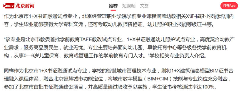 为进一步推动“1+X”证书制度试点工作,探索“岗课赛证融通”综合育人模式,助力技能人才培养与行业岗位技术标准的对接融合,北京市教委组织开展了2022年“1+X”书证融通试点专业申报与认定工作。经学校申报、培训实践、专家评审、综合评议等程序,认定14所院校的5个“X”证书相关专业为书证融通试点专业。2022年12月26日,北京市教育委员会下发了《北京市教育委员会关于公布2022年书证融通试点专业认定结果的通知》(京教函〔2022〕628号),bat365在线平台学前教育、智慧城市管理技术专业入选北京2022年“1+X”书证融通试点专业名单,试点专业将职业技能等级证书所体现的新技术、新工艺、新规范、新要求有机融入专业人才培养方案中,精准服务首都高品质民生和智慧城市建设。助力bat365在线平台相关专业制定学分转换方案,提升育人质量。并且BRTV新闻社会新闻专题报道了bat365在线平台两个试点专业的典型做法和经验。