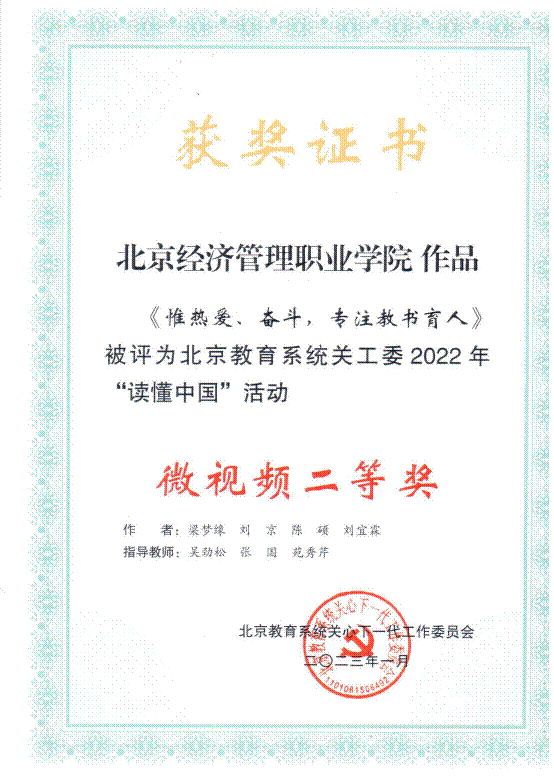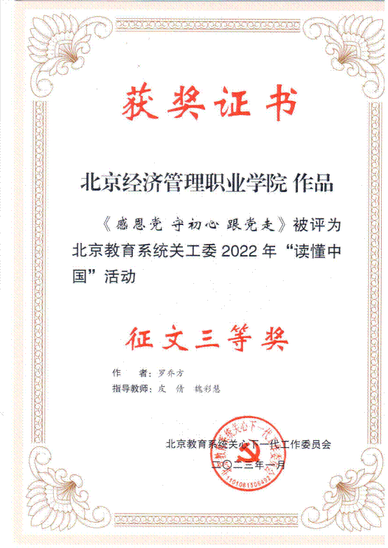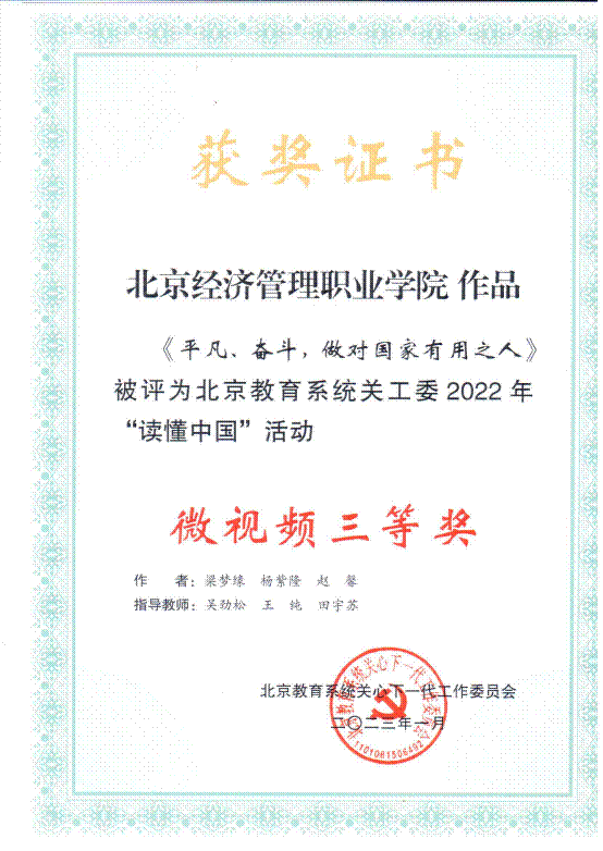 2022年北京教育系统关工委按照教育部关工委统一部署,以“共话百年奋斗,争做时代新人”为主题,在北京地区高校全面开展“读懂中国”活动。活动开启后,bat365在线平台关工委积极响应,认真组织、策划、开展,其中选送的以《惟热爱,奋斗,专注教书育人》为主题的微视频获评北京教育系统关工委2022年“读懂中国”活动微视频二等奖,《平凡,奋斗,做对国家有用之人》为主题的微视频获评北京教育系统关工委2022年“读懂中国”活动微视频三等奖,选送的《信仰浇筑平凡 奋斗淬炼人生》《惟愿此生成为烛 为党为国育新人》为主题的征文获评北京教育系统关工委2022年“读懂中国”征文二等奖,以《感恩党 守初心 跟党走》、《秉承教育使命,执着奋斗育新人》为主题的征文获评北京教育系统关工委2022年“读懂中国”征文三等奖,bat365在线平台关工委获评北京教育系统关工委2022年“读懂中国”活动优秀组织奖。