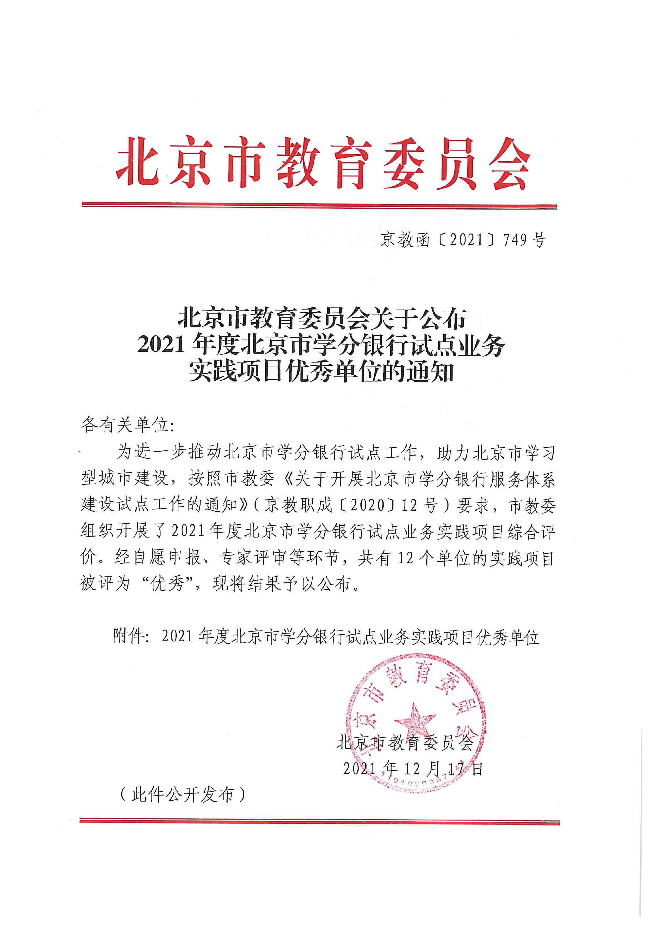12月17日,北京市教育委员会下发了《北京市教育委员会关于公布2021年度北京市学分银行试点业务实践项目优秀单位的通知》,经过学校申报和专家评审等环节,学校申报的《基于学分银行的非学历培训与学历教育融通实践研究—以bat365在线平台为例》项目被评为优秀,学校入选2021年度北京市学分银行试点业务实践项目优秀单位。