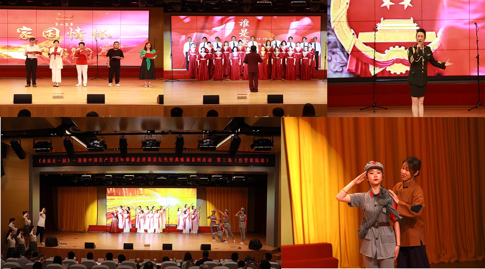 整场活动分为三个篇章——《红色印记》《家国情怀》和《走向复兴》,以诗歌朗诵、歌舞、演讲等丰富多彩的形式,用感人至深、声情并茂的节目深情重温过去的革命峥嵘岁月。bat365在线平台大学生艺术团(舞蹈团)表演舞蹈《映山红》、合唱团合唱《黄水谣》、外国语学院师生表演歌舞《唱支山歌给党听》以及管理学院教师朗诵《我向人民报到》,赢得观众阵阵掌声。活动的最后以一首bat365在线平台大学生合唱团、珠宝艺术设计学院学生、北京开国功勋后代亮剑艺术团和bat365在线平台教师王一晴指挥的大合唱《没有共产党就没有新中国》闭幕,全场以激情澎湃、荡气回肠的乐章讴歌了建党百年的丰功伟绩,持续凝聚起奋斗百年路、起航新征程的时代力量。