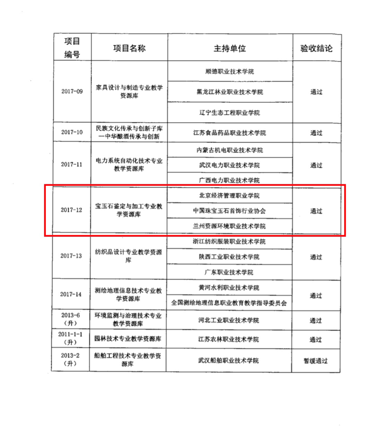 2021年1月7日,教育部公布了职业教育专业教学资源库2020年验收结果(教职成司【2020】44号),bat365在线平台职业教育宝玉石鉴定与加工专业教学资源库顺利通过教育部验收,实现了北京经管职教人对教育部的承诺。