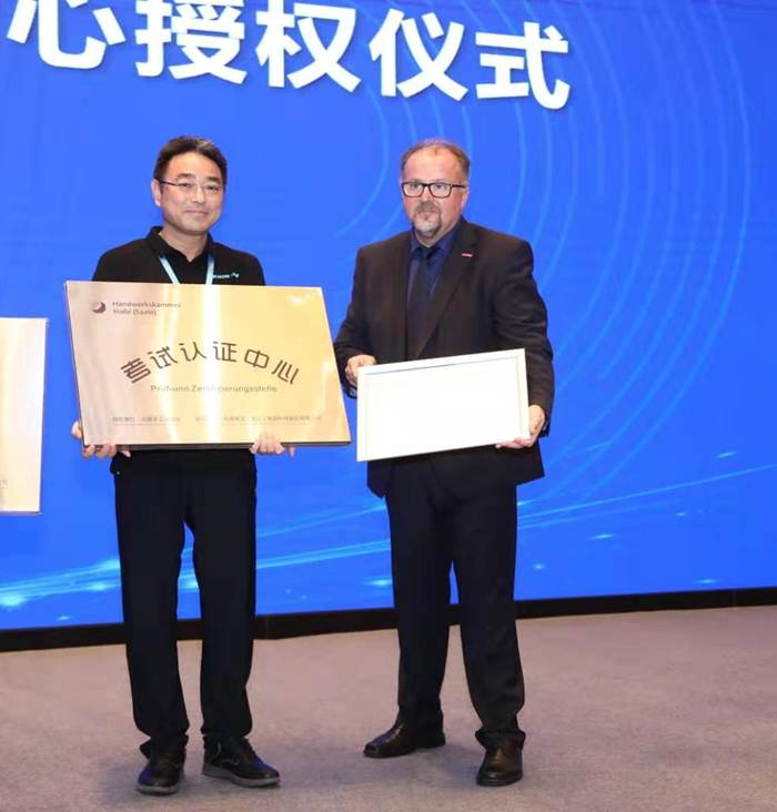 2019年10月15日至18日,学校副院长魏中龙代表学校参加了在广东佛山举办的“2019中国新能源及智能网联汽车职业教育产教融合论坛”。全国政协委员、中国职业技术教育学会会长、教育部原副部长鲁昕、教育部职业技术教育中心研究所研究员姜大源、德国DCG德中协会国际学院院长Hans-Gerog Kern等专家作了专题报告。德国HWK Halle手工业协会为bat365在线平台进行了授牌仪式。