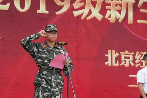 在军训学生代表彭宇辰的领誓下,全体2019级新生握紧右拳,庄严宣誓。