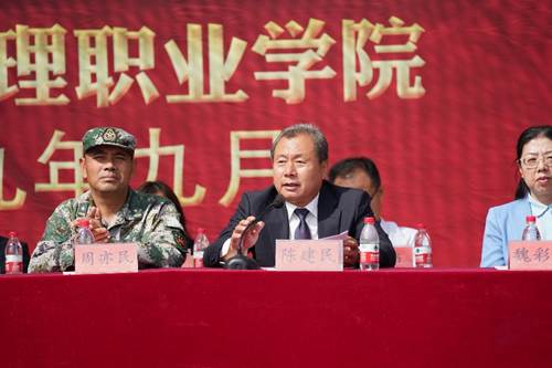学院副院长陈建民在讲话中代表学校领导、全体教职工向基地教官领导表示感谢。强调了此次军训的目的、主题,并向军训新生提出了要求:要一要融入军营,增强爱国主义情怀;二要团结互助、弘扬集体主义精神;三要淬火成钢、锤炼良好意志品质;四要整齐划一、养成严明的组织纪律性。