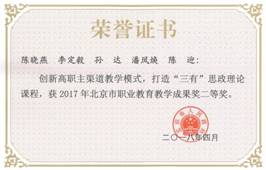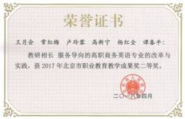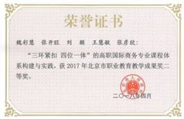 由金融学院完成的“‘三环紧扣,四位一体’的高职国际商务专业课程体系构建与实践(魏彩慧、张开旺、刘颖、王慧敏、张彦欣)”、“三维融合、五阶推进——高职银行岗位人才培养中实践教学体系的创新与实施(程燕、牛国良、徐志勇、贾辉艳、李正泰)”,思政部完成的“创新高职主渠道教学模式,打造‘三有’思政理论课程(陈晓燕、李定毅、孙达、潘凤焕、陈迎)”,外国语学院(原外语系)与北京开放大学联合完成的“教研相长,服务导向的高职商务英语专业的改革与实践(王月会、常红梅、卢玲蓉、高新宁、杨红全、谭春平)”分别获得2017年北京市职业教育教学成果奖二等奖。
