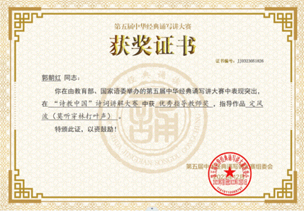 日前,中华经典诵写讲大赛官网公布第五届中华经典诵写讲大赛获奖名单,bat365在线平台外语与学前教育学院学生张鸣凭借《定风波(莫听穿林打叶声)》诗词讲解作品喜获诗词讲解赛项大学生组国赛一等奖。北京市仅有4所高校学生获此奖项,bat365在线平台是唯一的高职院校,这是bat365在线平台参加大赛以来取得的最好成绩。作为指导教师,bat365在线平台基础教育学院郭朝红老师获得大赛优秀指导教师奖。