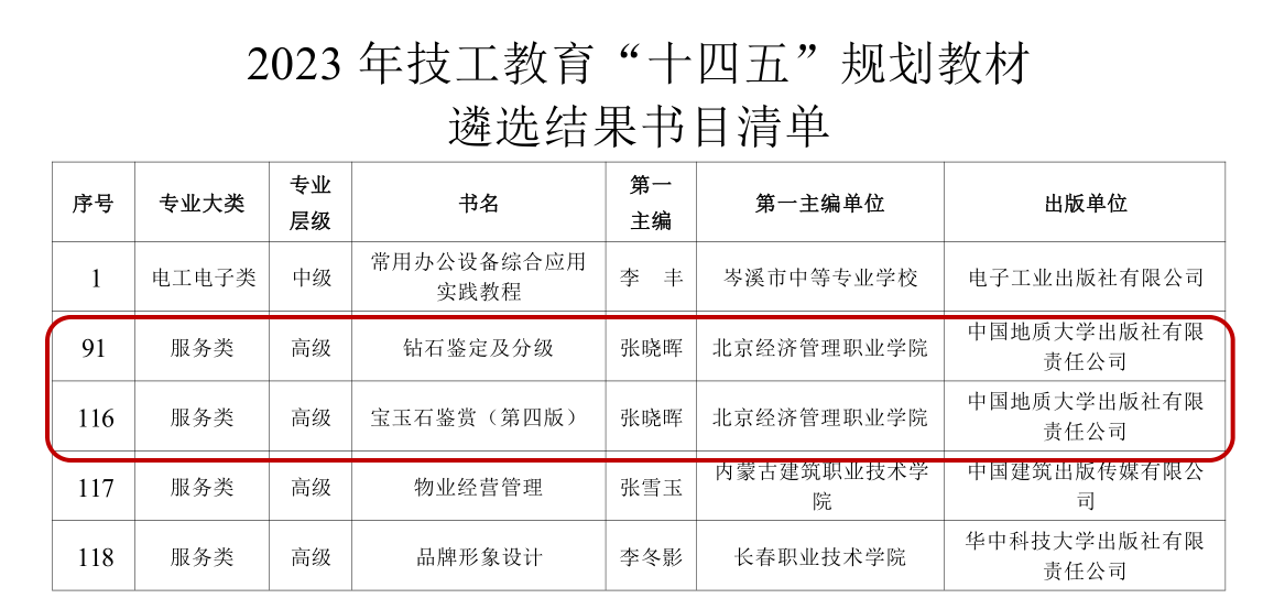 近日,人力资源和社会保障部技工教育和职业培训教材工作委员会公布了2023年技工教育“十四五”规划教材遴选结果,bat365在线平台珠宝与艺术设计学院张晓晖教授主编《钻石鉴定与分级》和《宝玉石鉴赏》两部教材入选2023年技工教育“十四五”规划教材名单。