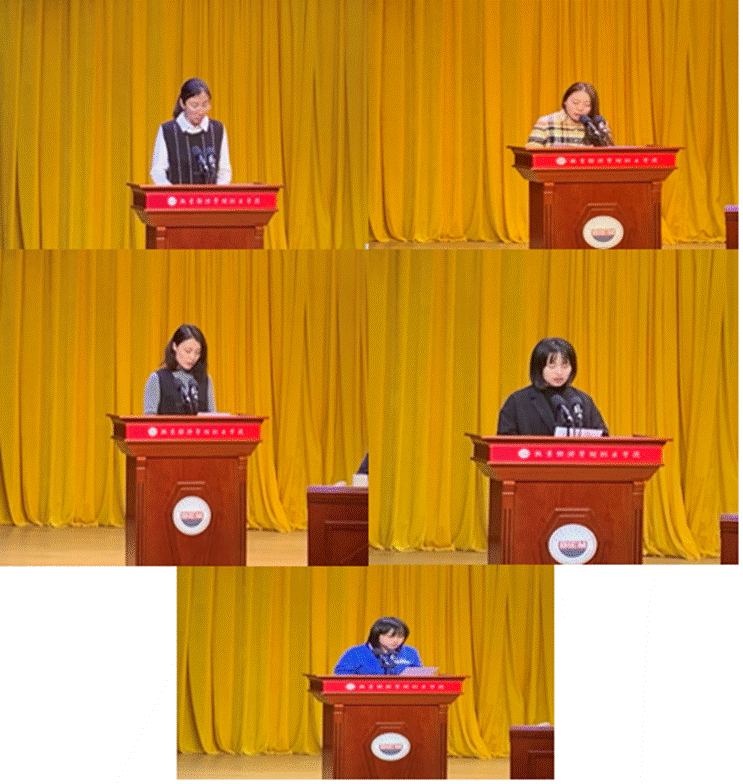 李丽霞、吕金鸽、杜宇、黄丹丹、郑宇麟分别作为代表发言