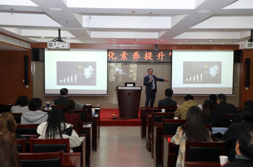 下午,英国德比大学首席副校长兼院长Alex Molasiotis以“用人工智能进行革命性的教育”为题给师生带来一场“校园国际化素养提升”专题讲座,全校一百余名师生聆听了讲座。讲座阐释了人工智能赋能教育的新途径、新方法和未来发展方向,师生积极互动提问,Alex Molasiotis均给予了详细解答。