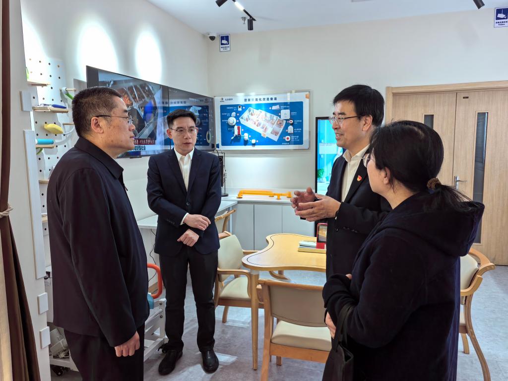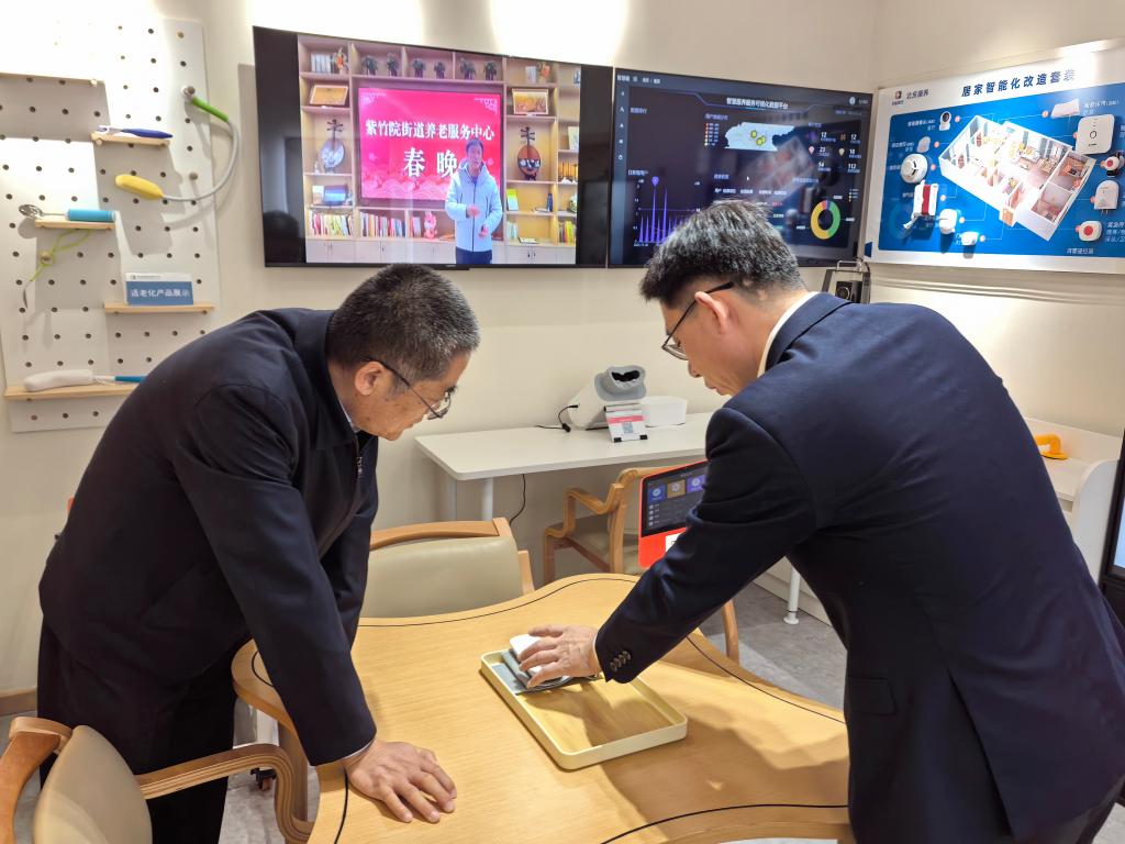 调研组一行重点考察了智慧康养平台系统、智慧健康管理中心、居家安全守护系统和房间智能设施设备,深入了解了智慧化养老创新运营模式与实践成果。据中心负责人介绍,紫竹院街道养老服务中心是北京市首家“养老服务综合体”,集机构、社区、居家养老服务于一体,覆盖助餐、健康监测、适老化改造等多元化场景,辐射周边22个社区,并通过“北康养e家”智慧平台整合300余家服务商。