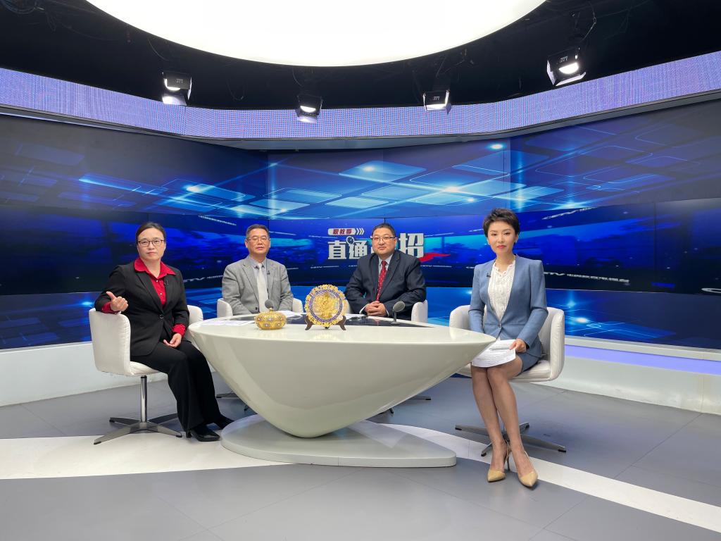 4月28日,bat365在线平台委员、招生就业处(就业创业指导中心)处长(主任)、校友联络发展处处长张玉涛,珠宝与艺术设计学院院长、珠宝科创产业学院执行院长(兼)张晓晖教授,先进制造学院院长、教务处副处长、实践实训办公室副主任周国娟教授代表学校应邀参加中国教育电视台2025《直通高招·职教季》节目现场直播。