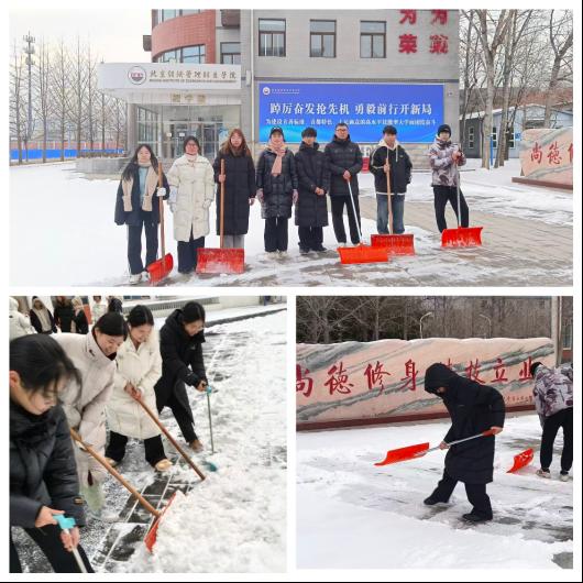 活动前,党委学生工作部与后勤管理处统筹落实安全保障、工具调配、区域划分等筹备工作,校团委细化清扫范围与人员分工,确保劳动实践分工有序、协作高效。现场师生分工协作、默契配合,铲雪、扫雪、清运积雪等环节衔接有序,重点对校园主干道、教学楼出入口、公寓楼门前等关键通行区域开展全面清扫,用汗水消融冰雪,用行动守护平安。尽管冬日寒风凛冽,但师生们热情高涨、干劲十足,校园内处处是热火朝天的劳动身影,奏响了“团结协作、爱校奉献”的冬日赞歌。