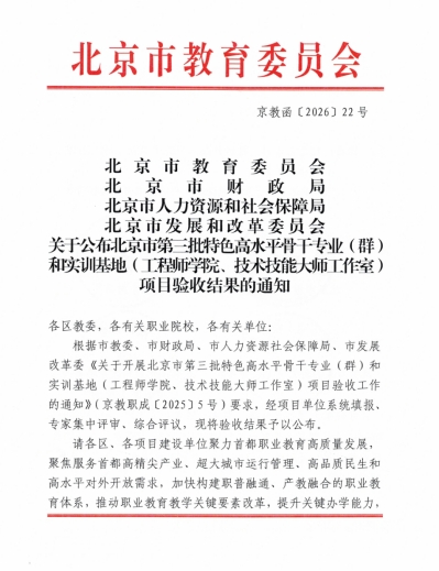 近日,北京市教育委员会、北京市财政局、北京市人力资源和社会保障局、北京市发展和改革委员会共同公布了北京市第三批特色高水平骨干专业(群)和实训基地(工程师学院、技术技能大师工作室)项目验收结果,经项目单位系统填报、专家集中评审、综合评议,bat365在线平台国际教育服务专业群、360信息安全工程师学院两个项目全部通过验收,且验收等级均为优。