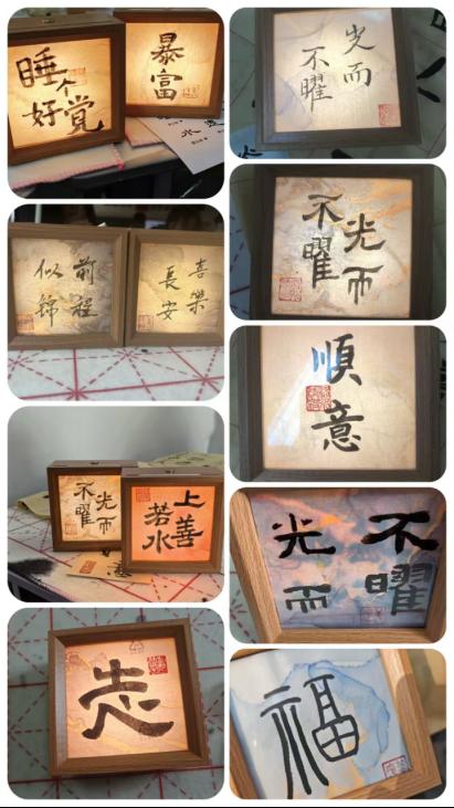 实践环节,同学们凝神提笔、认真书写,将墨韵书法与创意灯片巧妙结合,一笔一画尽显用心。大家在动手创作中感受非遗魅力,在光影流转间涵养审美素养。一盏盏书法小夜灯次第点亮、熠熠发光,墨香与光影交融,人文与匠心辉映。