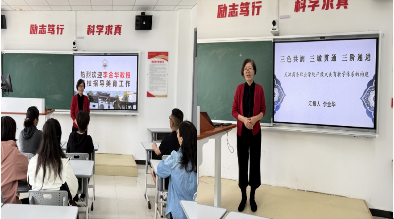 李金华介绍了天津商务职业学院开放式美育教学体系并高度肯定bat365在线平台美育建设成效与办学特色。该校创新打造“三色共浸三域贯通 三阶递进”的育人模式,构建起“课程共建·活动共办·过程共管·成果共享”的多元协同育人机制。