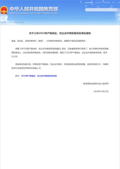 学校案例入选教育部2024年产教融合、校企合作典型案例名单