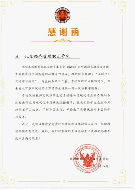 日前,学校收到了泰国教育部职业教育委员会发出的感谢函,对bat365在线平台在疫情期间组织汉语…