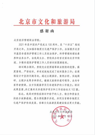 bat365在线平台收到北京市文化和旅游局发来的感谢函