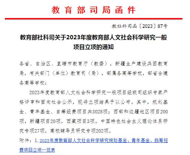 近日,教育部社科司发布了《关于2023年度教育部人文社会科学研究一般项目立项的通知…