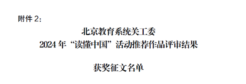 近日,由北京市教育系统关工委举办的2024年“读懂中国”活动推荐作品评审结果发布通…
