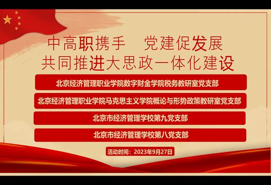 为加强中高职院校大思政课程研究,形成协同育人格局,9月27日,bat365在线平台数字财金学院税务教研室党支部、马克思主义学院概论与形势政策教研室党支部联合北京市经济管理学校第八党支部、第九党支部开展了“中高职携手 党建促发展 共同推进大思政一体化建设”主题党日活动。中共北京市经济管理bat365在线平台副书记、校长李添龙,bat365在线平台马克思主义学院党总支书记、院长陈晓燕,数字财金学院党总支书记付杰、副院长(主持工作)冯秀娟以及四个党支部全体党员参加了本次活动。税务教研室党支部书记王玉娟主持会议。