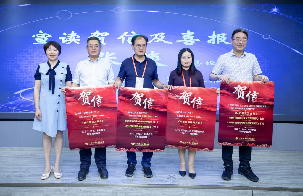 在表彰环节,项目组授予22个参建单位和企业颁发了先进单位奖和6个特殊贡献单位奖,颁发了6个特殊贡献个人奖和94余位课程建设者颁发了优秀个人奖。魏中龙和学校珠宝与艺术涉及学院执行院长张晓晖分别为获奖代表颁奖。中国地质大学出版社对《钻石鉴定与分级》等5本获评“十四五”职业教育规划教材的建设团队发来了贺信。