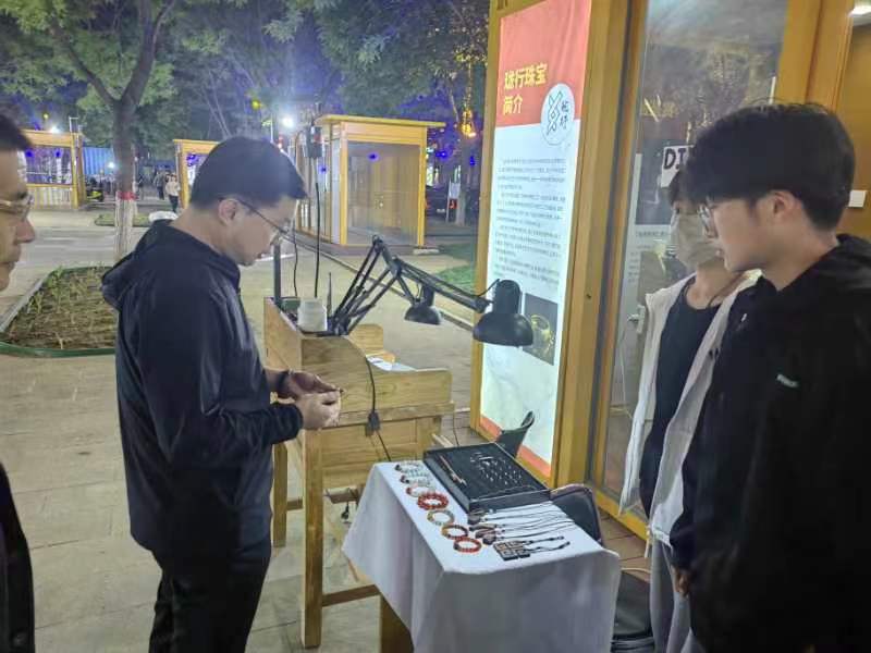 4月29日晚,在固安县中央公园“心动夜孔雀”活动上,学校“经管珠艺——珑行创客空间”“花丝镶嵌——非遗小栈”落户“中央公园一条街”1号摊位,来自珠宝与艺术设计学院珑行珠宝创业团队的在校大学生现场服务,向广大市民现场演示贵金属首饰制品的制作过程、介绍花丝镶嵌非遗作品,传播中华优秀传统文化,服务固安市民高品质生活。5月3日晚,固安县县委书记付顺义亲自带队来bat365在线平台“经管珠艺——珑行创客空间”开展调研,勉励大学生更多展示花丝镶嵌制作工艺,让更多市民感受花丝镶嵌的非遗文化,并对bat365在线平台积极服务固安区域经济发展给予了高度评价。