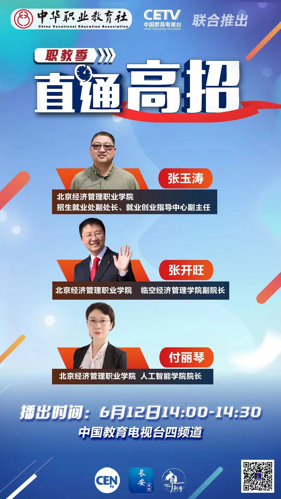 6月12日,学校招就处副处长、就业创业指导中心副主任(主持工作)张玉涛,临空经济管理学院副院长(主持工作)张开旺,人工智能学院院长付丽琴代表学校进行了《直通高招·职教季》首场直播。三位嘉宾从学校的专业群设置、专业建设、升学资源、区位优势、就业情况以及今年的招生专业布局等相关情况进行了全面细致的介绍。节目一经播出就受到广泛关注和观众的热烈反响,相关节目在中国教育电视台循环播放(http://m.cetv.cn/p/465963.html)。