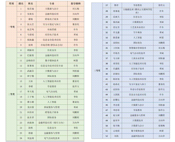 排名前10%的校赛选手晋级省赛,经过激烈竞争,9名同学荣获市级奖项。其中,两位同学脱颖而出晋级国赛,最终数字财金学院金融科技应用专业的宋雨乐同学获得全国决赛二等奖的好成绩。