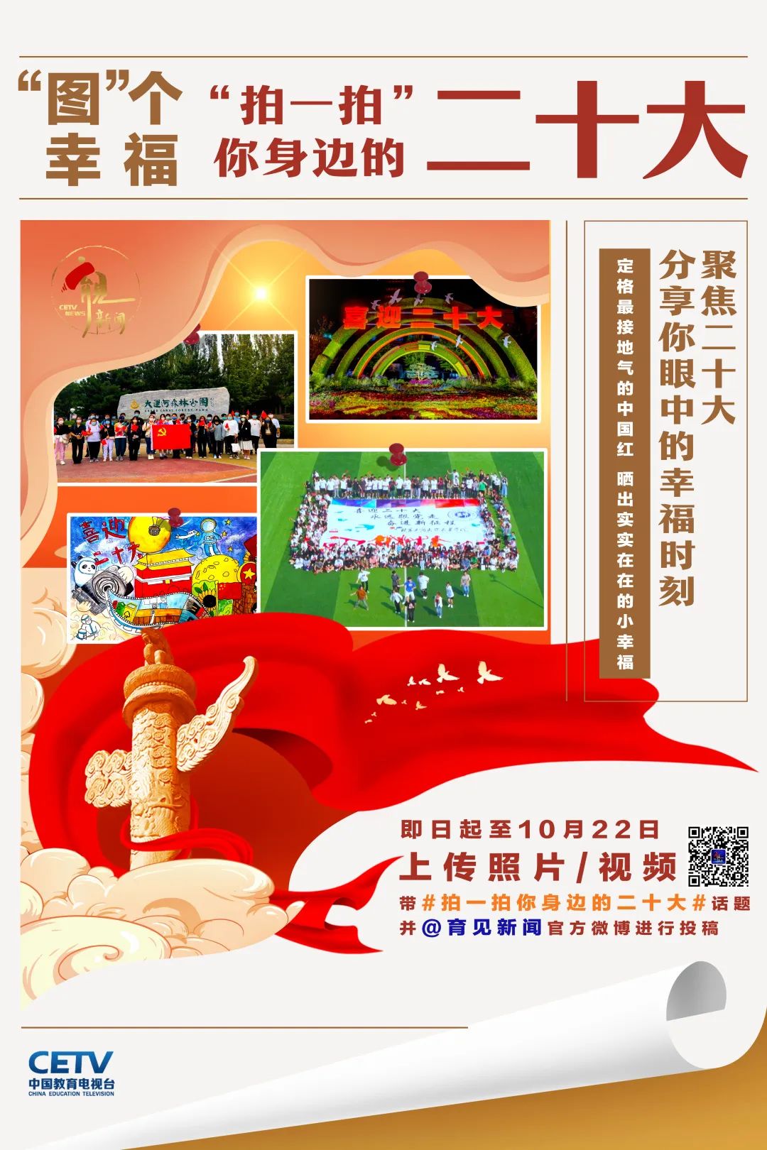 为庆祝党的二十大胜利召开,10月13日至22日,中国教育电视台独家发起“拍一拍你身边的二十大”微拍活动。学校积极组织、广泛征集,从党委宣传部、校团委和各专业群学院的积极投稿中遴选出19则优秀作品报送至中国教育电视台,最终有7则作品喜登中国教育电视台“拍一拍你身边的二十大”活动栏目展播。