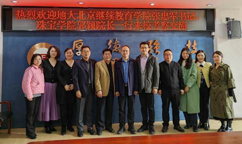 3月13日上午,中国地质大学(北京)继续教育学院党委书记张忠军、珠宝学院院长郭颖、继续教育学院刘杰、珠宝学院胡哲一行到学校考察交流。珠宝与艺术设计学院党总支书记王朋信、执行院长张晓晖,培训学院院长张英华参加了座谈。会议由珠宝与艺术设计学院宝石教研室主任武改朝主持。
