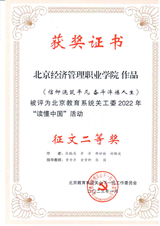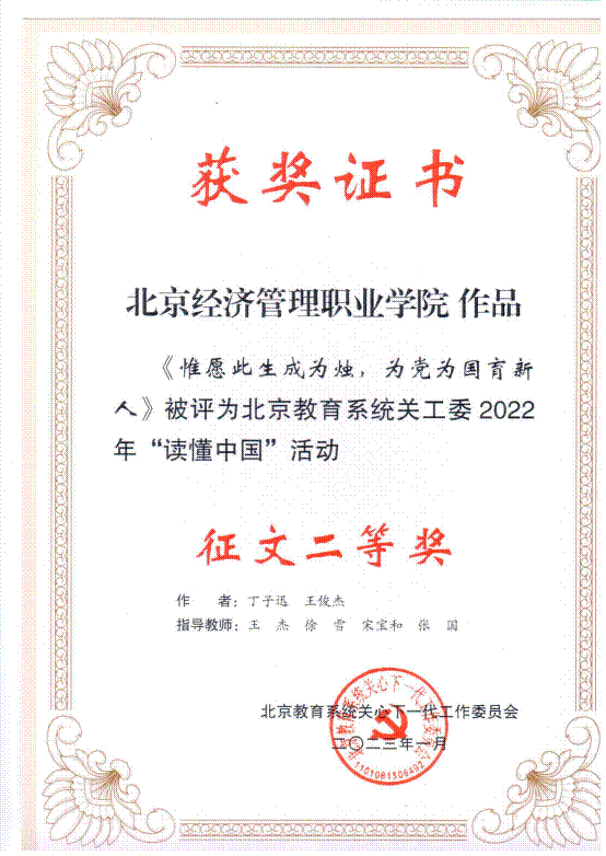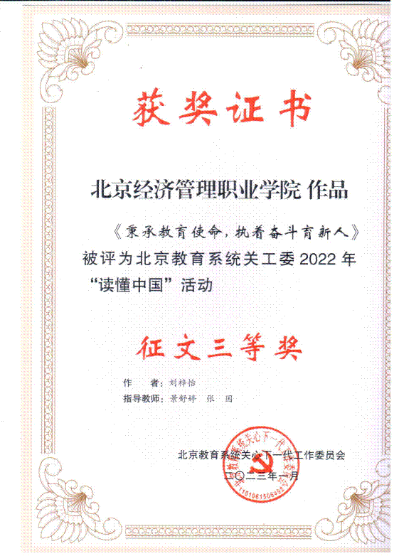 2022年北京教育系统关工委按照教育部关工委统一部署,以“共话百年奋斗,争做时代新人”为主题,在北京地区高校全面开展“读懂中国”活动。活动开启后,bat365在线平台关工委积极响应,认真组织、策划、开展,其中选送的以《惟热爱,奋斗,专注教书育人》为主题的微视频获评北京教育系统关工委2022年“读懂中国”活动微视频二等奖,《平凡,奋斗,做对国家有用之人》为主题的微视频获评北京教育系统关工委2022年“读懂中国”活动微视频三等奖,选送的《信仰浇筑平凡 奋斗淬炼人生》《惟愿此生成为烛 为党为国育新人》为主题的征文获评北京教育系统关工委2022年“读懂中国”征文二等奖,以《感恩党 守初心 跟党走》、《秉承教育使命,执着奋斗育新人》为主题的征文获评北京教育系统关工委2022年“读懂中国”征文三等奖,bat365在线平台关工委获评北京教育系统关工委2022年“读懂中国”活动优秀组织奖。