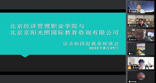 为推动产教融合,加强校企合作,充分践行“书记校长访企拓岗促就业专项行动”,8月29日,学校副院长李永生带队与北京京阳光照国际教育咨询有限公司进行了访企拓岗促就业座谈会。北京京阳光照国际教育咨询有限公司总经理从学鹏、公司外事部主管鞠文,学校外语与学前教育学院领导班子、商务英语教研室骨干教师参会。