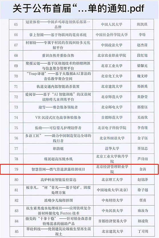 马克思主义学院袁阳等老师指导的《智慧管网-燃气管道泄露检测项目》由高瑞臣老师主导,金涛、郑岩、张景治、彭文超等同学联合参赛,引进中国矿业大学(北京)国家重点实验室技术,在社会服务赛道上晋级,荣获首届“京彩大创”北京大学生创新创业大赛分赛道“百强创业团队”称号。