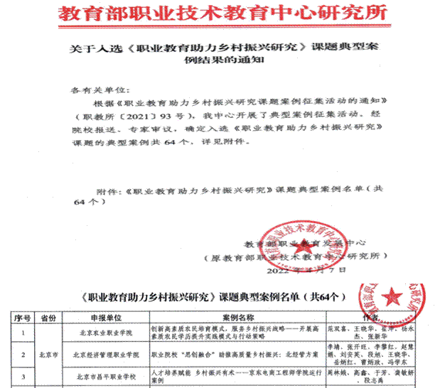 据悉,此次案例征集由教育部职业教育发展中心(原教育部职业技术教育中心研究所)发起,面向全国高职院校和中职学校,旨在总结各职业院校服务乡村振兴经验,为《职业教育助力乡村振兴研究》课题研究提供支持,更好地服务乡村振兴战略实施。此次案例征集,共收到全国220多个中高职院校提交的案例,64个案例最终入选,北京市3所职业院校3项案例入选。