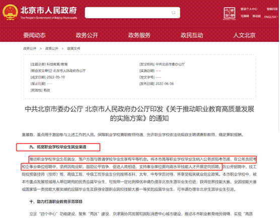 近日,北京市人民政府办公厅印发《关于推动职业教育高质量发展的实施方案》的通知,其中提到要把北京市高职院校毕业生纳入公务员招考范围引发广泛关注,此项政策一出,对于高职院校学生而言,更像是一道光。