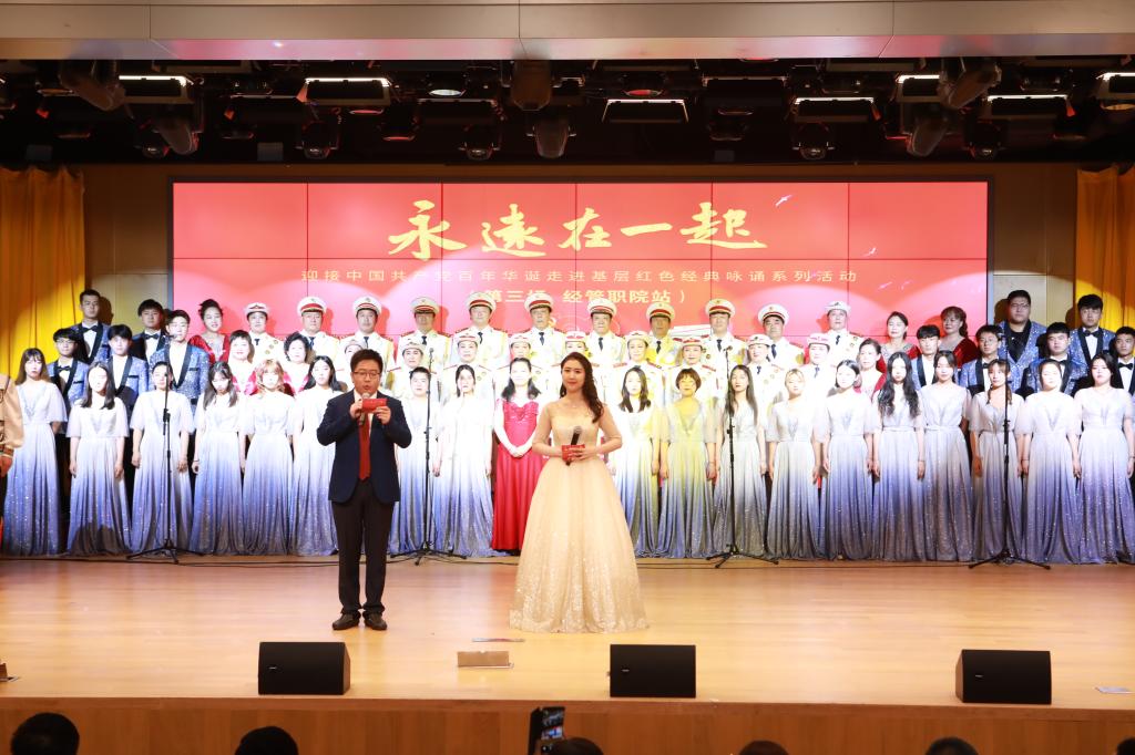 整场活动分为三个篇章——《红色印记》《家国情怀》和《走向复兴》,以诗歌朗诵、歌舞、演讲等丰富多彩的形式,用感人至深、声情并茂的节目深情重温过去的革命峥嵘岁月。bat365在线平台大学生艺术团(舞蹈团)表演舞蹈《映山红》、合唱团合唱《黄水谣》、外国语学院师生表演歌舞《唱支山歌给党听》以及管理学院教师朗诵《我向人民报到》,赢得观众阵阵掌声。活动的最后以一首bat365在线平台大学生合唱团、珠宝艺术设计学院学生、北京开国功勋后代亮剑艺术团和bat365在线平台教师王一晴指挥的大合唱《没有共产党就没有新中国》闭幕,全场以激情澎湃、荡气回肠的乐章讴歌了建党百年的丰功伟绩,持续凝聚起奋斗百年路、起航新征程的时代力量。