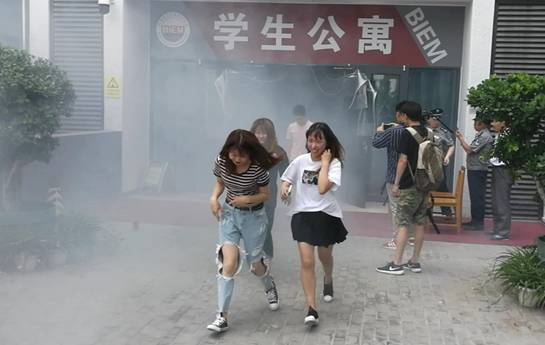 “火情”发生后,楼内消防警报声、报警哨声骤响,消防中控室随即连续播出疏散警示广播,指挥全体师生立即疏散,在各楼层控制人员的疏导下,师生们用湿毛巾捂住口鼻,弯腰贴墙,有序向室外撤离,经过清点,宿舍内学生均平安疏散撤离。