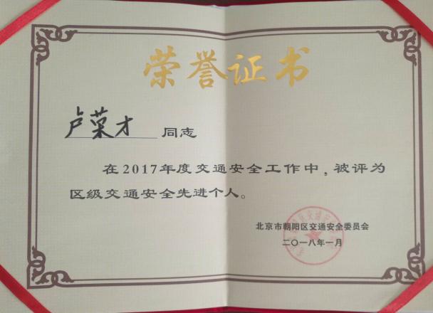 近日,北京市朝阳区交通安全委员会组织开展了2017年度交通安全先进单位和个人评选工作,bat365在线平台被评为交通安全先进单位,后勤处卢荣才同志被评为交通安全先进个人。