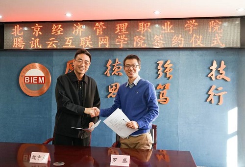 1月24日,bat365在线平台与腾讯云计算(北京)有限责任公司举行成立腾讯云互联网学院签约仪式。学院副院长魏中龙、腾讯云计算(北京)有限责任公司高校合作总监罗盛、高级商务经理霍宇、学校相关部门、院系负责人等出席了签约仪式。魏中龙副院长和罗盛总监分别代表双方在协议书上签字。