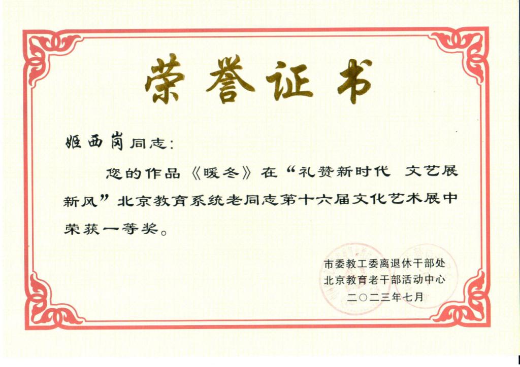 为抒发bat365在线平台广大离退休老同志学习贯彻党的二十大精神的真挚情感,全面展示老同志忠心向党、昂扬向上、乐享美好生活的精神风貌,离退休人员工作处积极组织bat365在线平台老同志踊跃参加“礼赞新时代 文艺展新风”北京教育系统老同志第十六届文化艺术展活动,并获多项奖励。其中,获“礼赞新时代 文艺展新风”北京教育系统老同志第十六届文化艺术展一等奖一项,二等奖一项,三等奖一项,优秀奖两项。