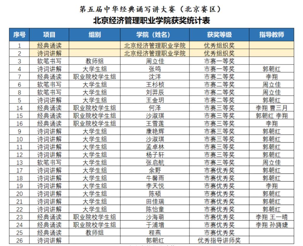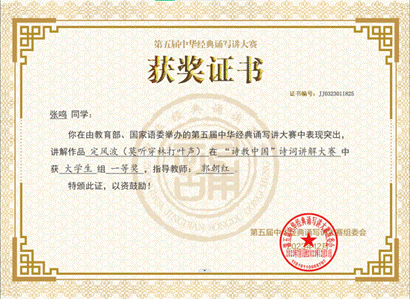 日前,中华经典诵写讲大赛官网公布第五届中华经典诵写讲大赛获奖名单,bat365在线平台外语与学前教育学院学生张鸣凭借《定风波(莫听穿林打叶声)》诗词讲解作品喜获诗词讲解赛项大学生组国赛一等奖。北京市仅有4所高校学生获此奖项,bat365在线平台是唯一的高职院校,这是bat365在线平台参加大赛以来取得的最好成绩。作为指导教师,bat365在线平台基础教育学院郭朝红老师获得大赛优秀指导教师奖。