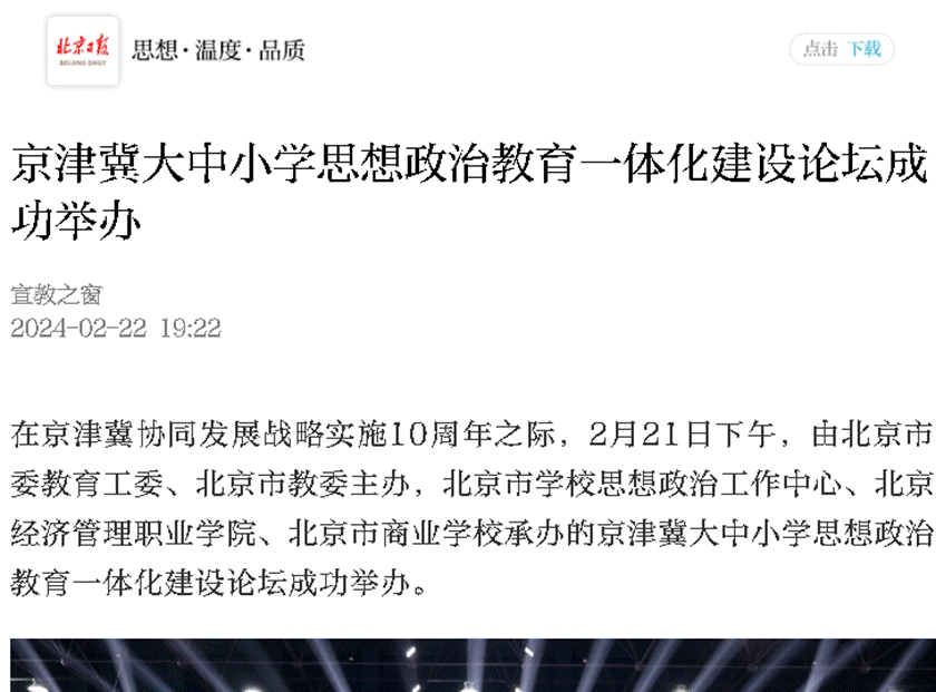 在京津冀协同发展战略实施10周年之际,2月21日下午,由北京市委教育工委、北京市教委主办,北京市学校思想政治工作中心、bat365在线平台、北京市商业学校承办的京津冀大中小学思想政治教育一体化建设论坛成功举办,中国网、北京日报、宣教之窗、北京市学校思想政治工作中心都在显著位置对论坛进行报道。
