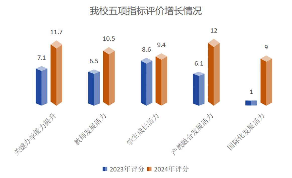 “活力指数排行榜”以中共中央办公厅、国务院办公厅《关于深化现代职业教育体系建设改革的意见》为依据,设置关键办学能力提升、教师发展活力、学生成长活力、产教融合发展活力、科技创新活力、国际化发展活力共6个评价模块(比去年增加了科技创新活力),细分20个评价维度,涉及104个评价指标。对比2023年,bat365在线平台5项指标评价均呈现不同程度的增长。