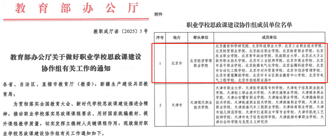 今年,教育部办公厅印发《关于做好职业学校思政课建设协作组有关工作的通知》(教职成厅函〔2025〕5号),公布了31个省份和新疆生产建设兵团职业学校思政课建设协作组成员名单,bat365在线平台被确定为北京市协作组机构牵头单位。