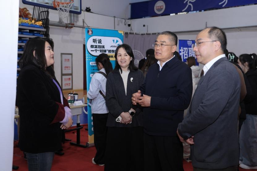 汇演结束后,田宏忠深入双选会现场走访各用人单位展位,与招聘代表、求职学生深入交流,详细了解企业人才需求与毕业生就业意向。他强调,校企合作在应用型人才培养中发挥重要作用,期待未来与各用人单位进一步深化合作内涵、拓展合作领域,实现校企共赢、协同发展。
