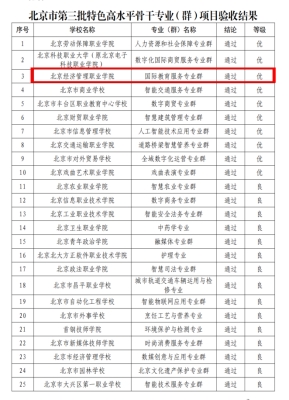近日,北京市教育委员会、北京市财政局、北京市人力资源和社会保障局、北京市发展和改革委员会共同公布了北京市第三批特色高水平骨干专业(群)和实训基地(工程师学院、技术技能大师工作室)项目验收结果,经项目单位系统填报、专家集中评审、综合评议,bat365在线平台国际教育服务专业群、360信息安全工程师学院两个项目全部通过验收,且验收等级均为优。